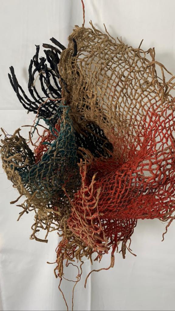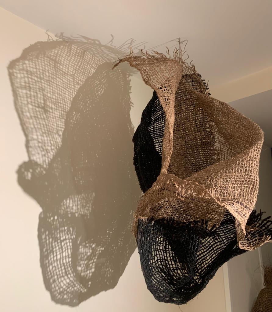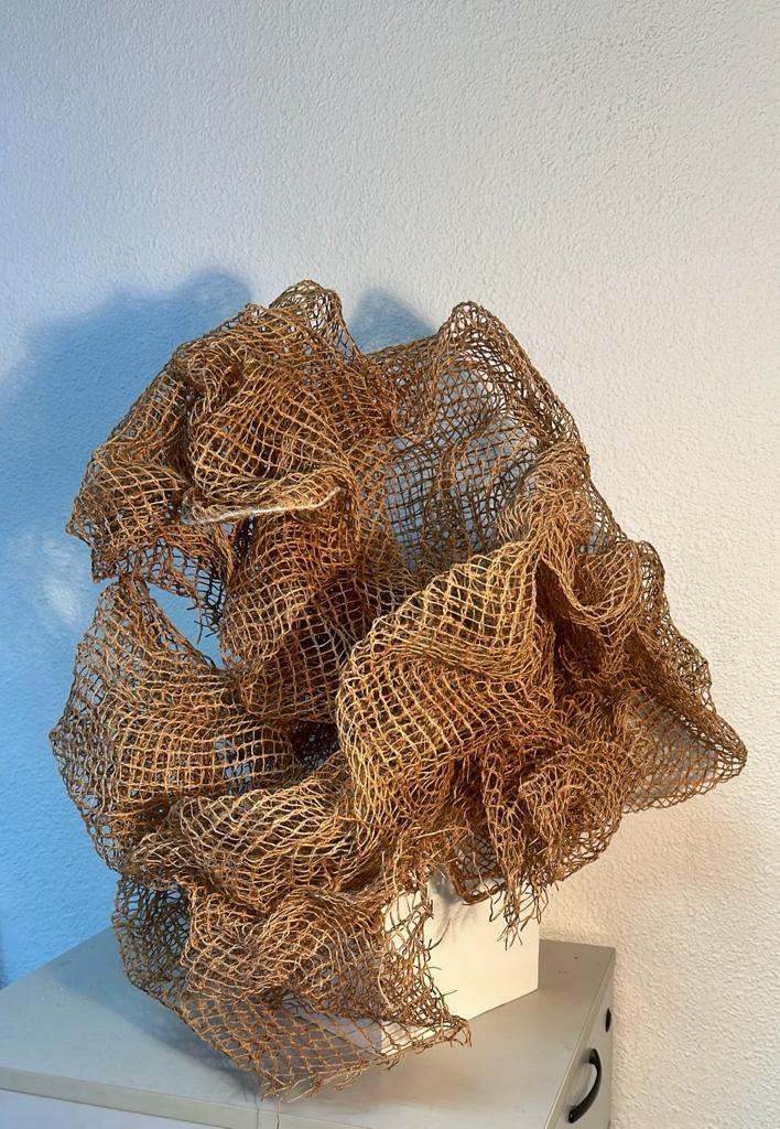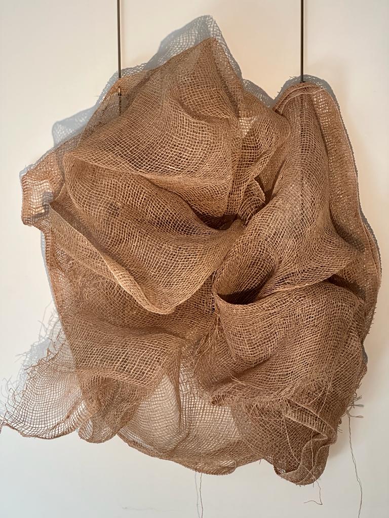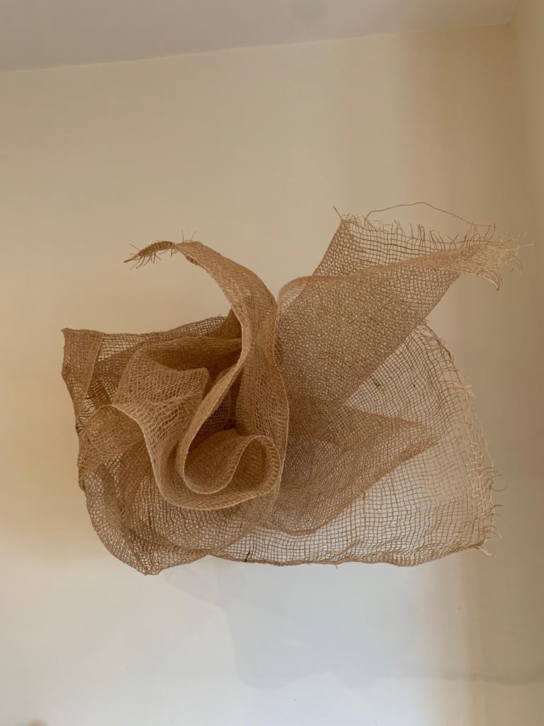 Aquí el yute está poco endurecido para poder manipular mejor la pieza. Va cosida, dándole formas que buscan la libertad del yute.