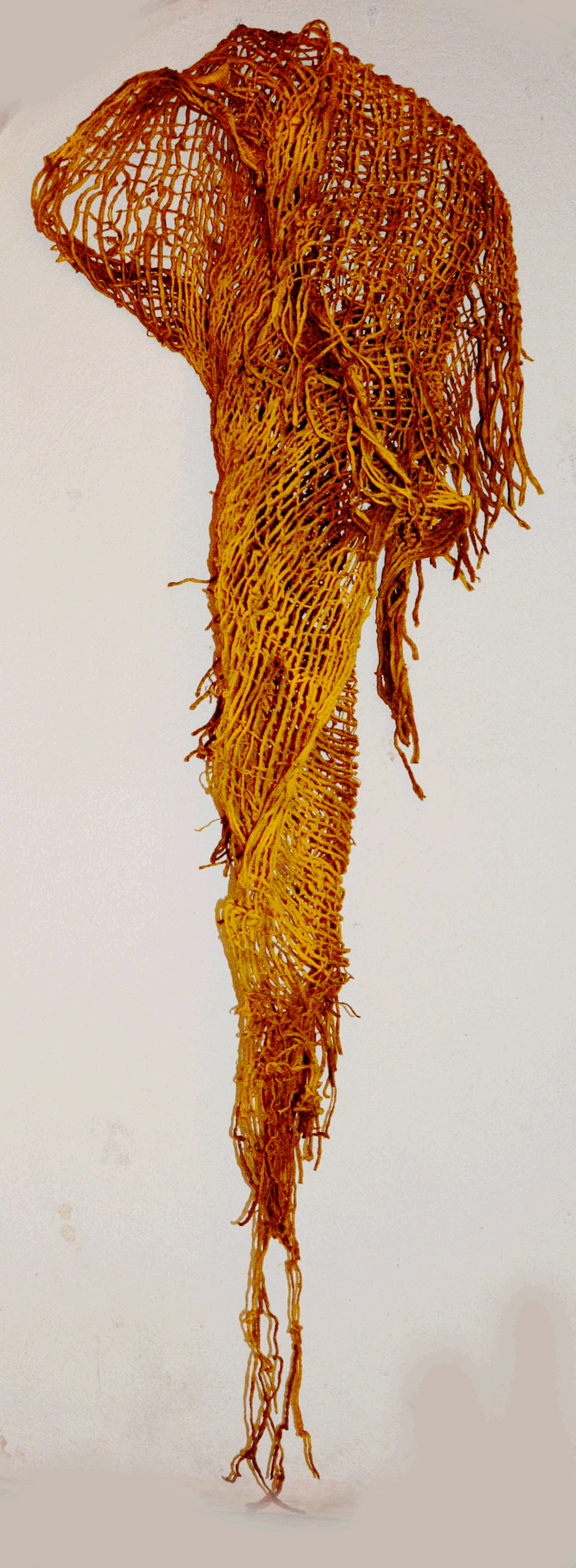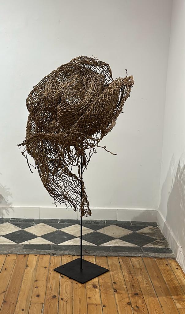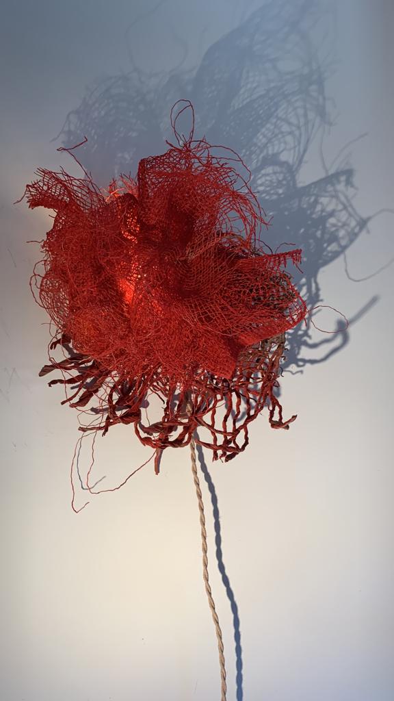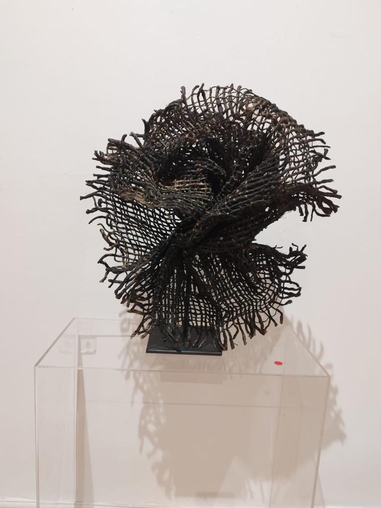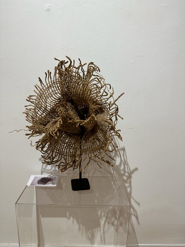Aquí el yute está poco endurecido para poder manipular mejor la pieza. Va cosida, dándole formas que buscan la libertad del yute.