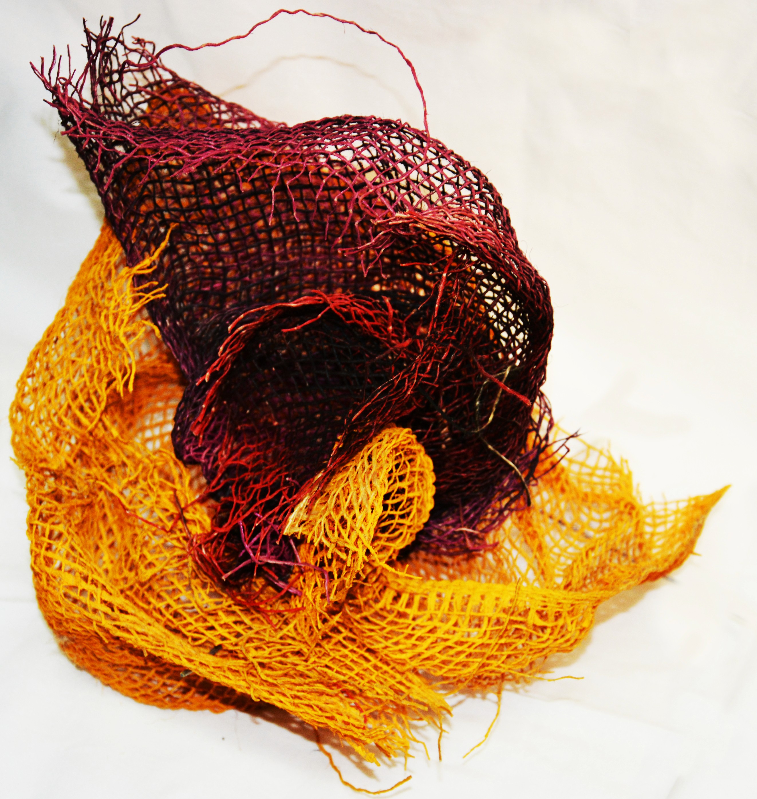 Endurecimiento del yute más fino, teñido en fucsia, rojo, negro y amarillo. Cosido en ciertos puntos de la obra.