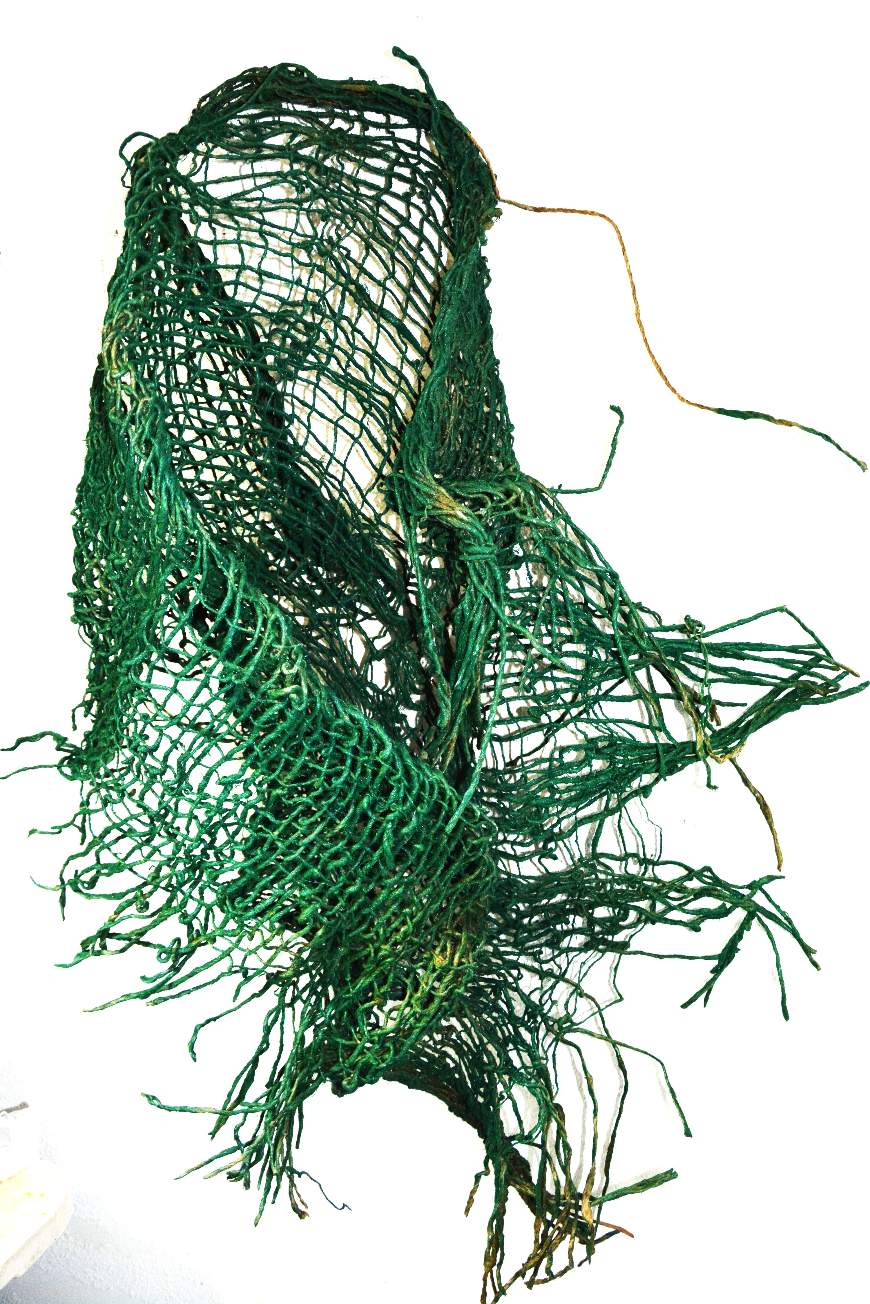 Yute muy grueso endurecido, secado dándole formas y posterior teñido con spray verde.