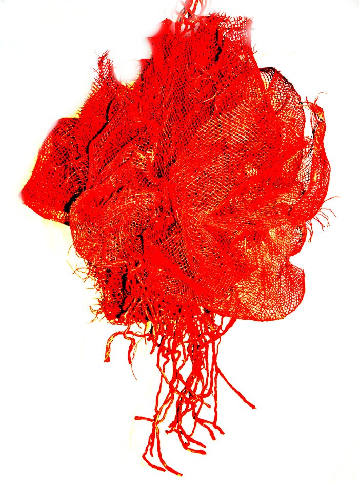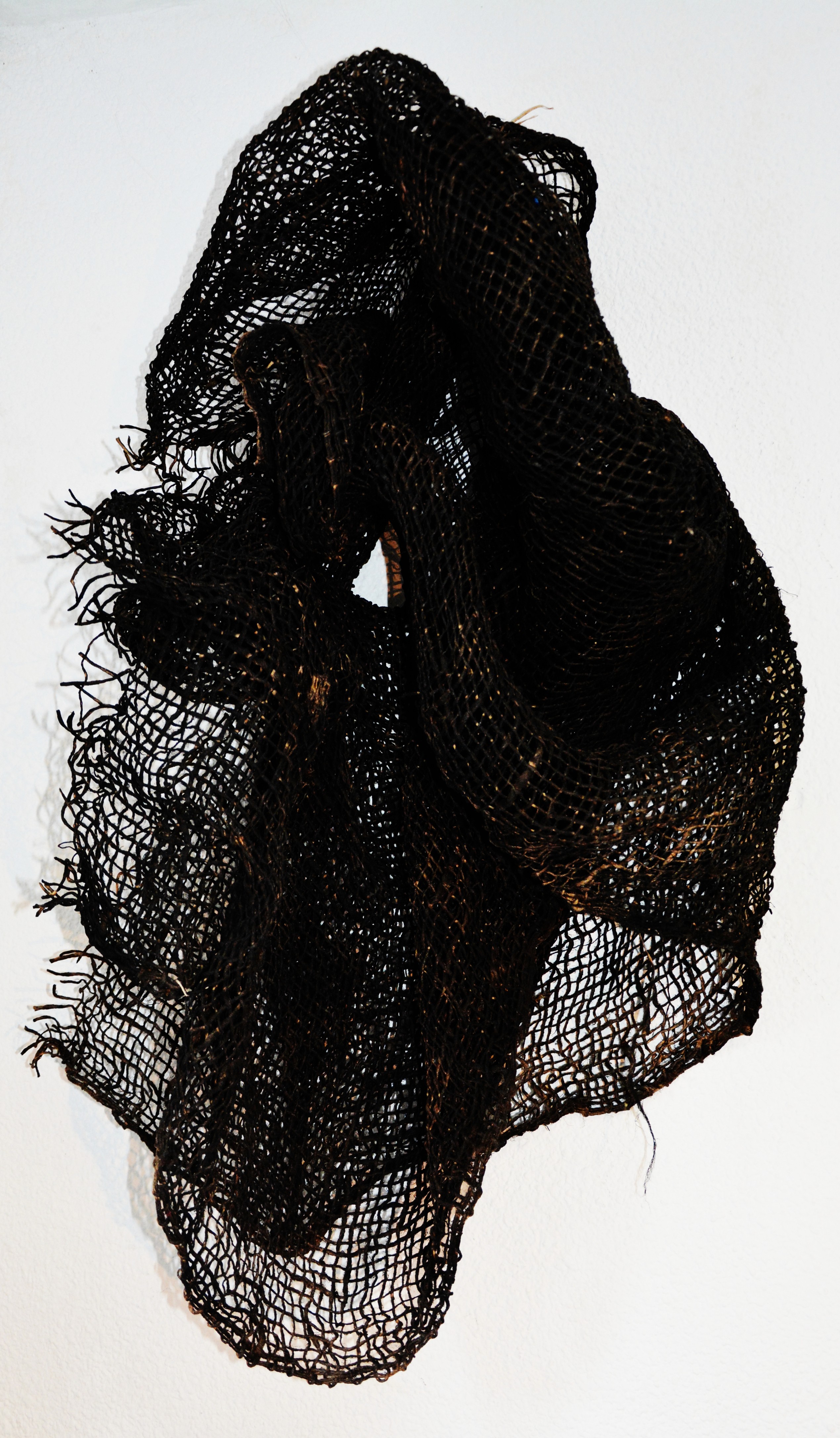 Obra hecha con yute de trama media. Va teñido en partes de color negro y rojo. Está poco endurecido y va cosido haciendo formas y pliegues.