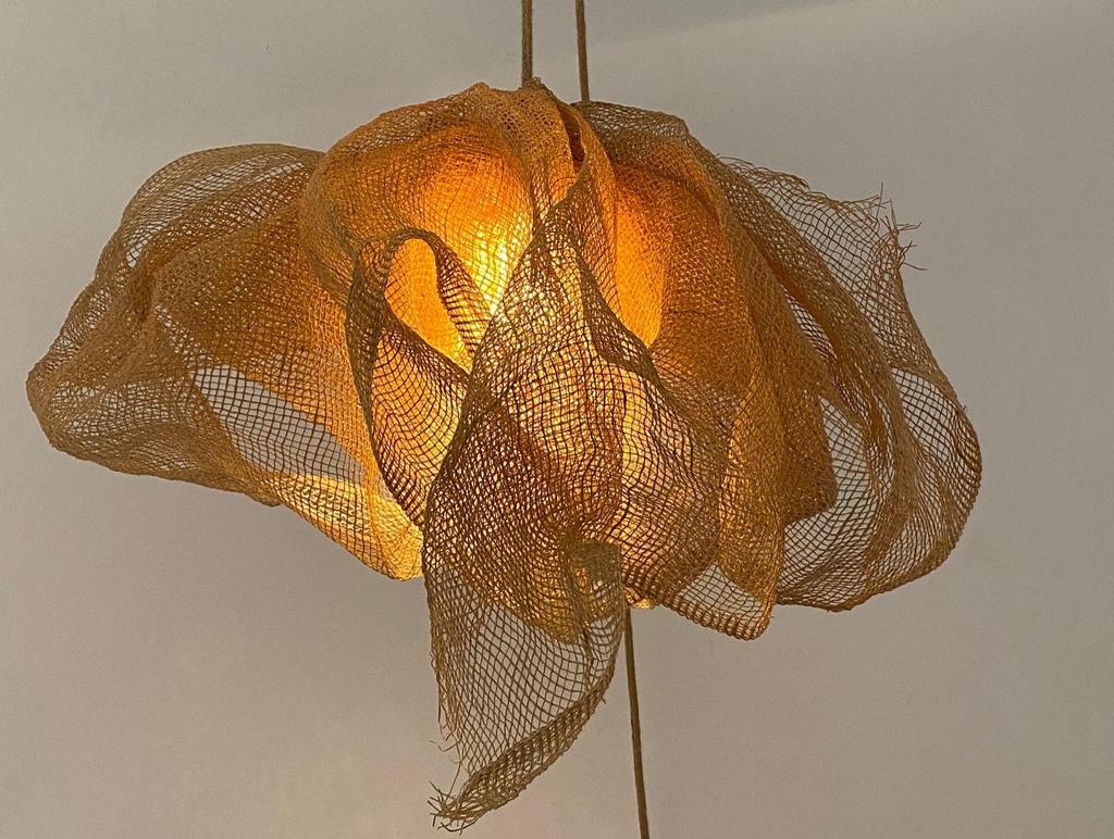 Es una pieza realizada con el yute más fino que se mezcla con el más grueso. Lleva una luz tenue en su interior y el cable, en yute entrelazado es parte de la obra, como si de un cordón umbilical se tratara. Inspirada en “Medusa de Perseo “ (Benvenuto Cellini)