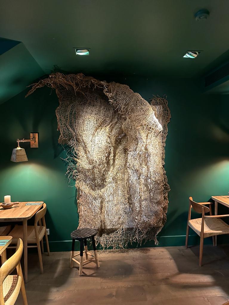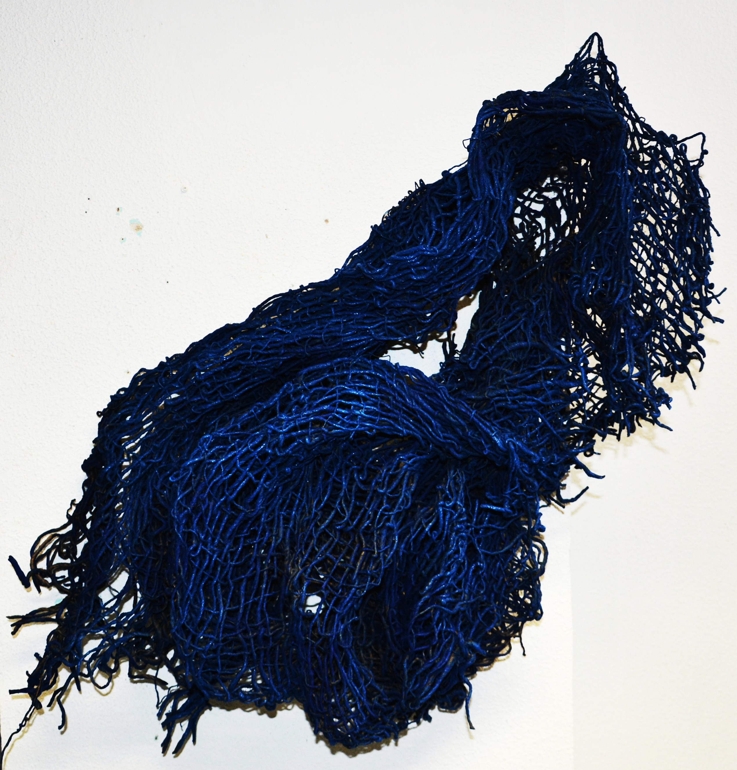 Instalación realizada con el yute más grueso. Realizada con varias capas superpuestas, cosidas y fijadas en pared y techo. Capta el movimiento en el mar.