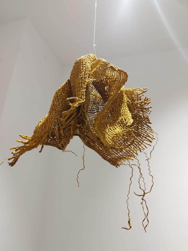 Endurecimiento de yute muy grueso, secado dándole formas y teñido con spray amarillo.