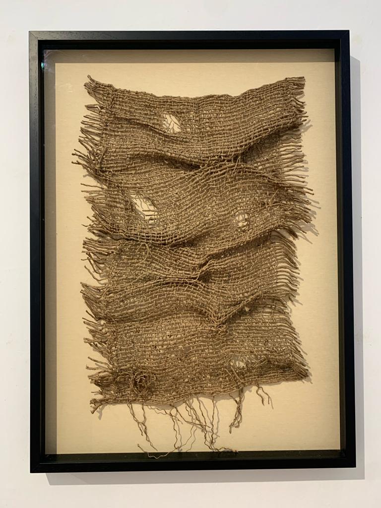 Caja con yute. Tiene pliegues con agujeros y algún deshilachado. Cada pliegue refleja la protección de uno mismo.